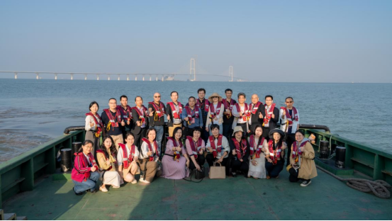 会员代表前往深中通道施工总营地码头,乘船参观深中通道伶仃洋大桥,从海面上近距离参观大湾区核心枢纽工程的魅力,深入了解其优越的地理位置和在粤港澳大湾区扮演着重要的角色,以及通道的开通为中山的经济发展和城市建设带来的机遇和挑战。