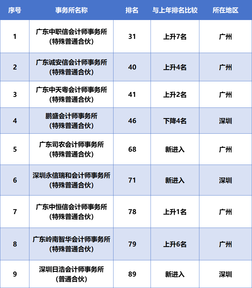 近日,中国注册会计师协会发布《2023年度会计师事务所综合评价百家排名信息》,我省9家会计师事务所上榜,上榜数量为历年之最!与上一年相比,广东中职信、广东诚安信、广东中天粤等5家事务所均有不同程度的上升。新增广东司农、深圳永信瑞和、深圳日浩等3 家会计师事务所上榜。