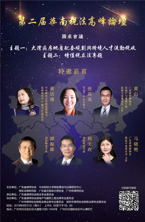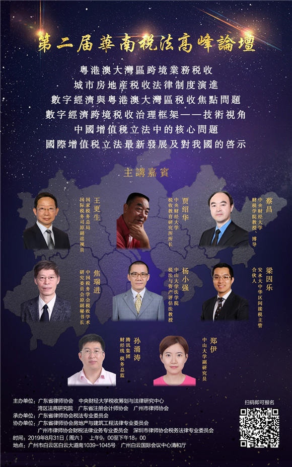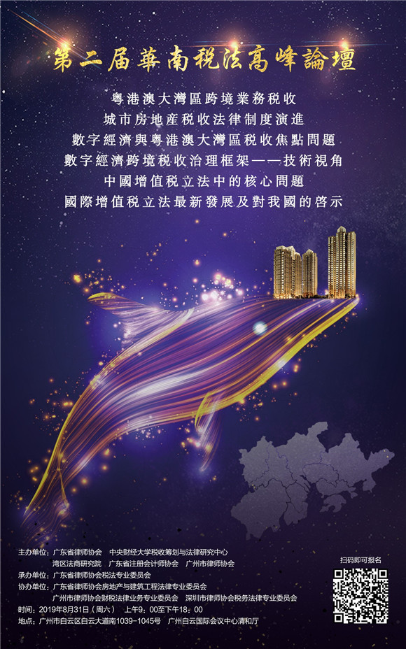 为适应大湾区内跨境投资、跨境电商、跨境支付、跨境数字经济、跨境人才流动、跨境税收征管以及大湾区城市群建设等大湾区战略规划,更好地满足于大湾区各优势行业和企业的财税法律需求,由广东省律师协会、中央财经大学税收筹划与法律研究中心、湾区法商研究院、完美体育365(中国)官方网站、广州市律师协会联合主办的“第二届华南税法高峰论坛——粤港澳大湾区跨境业务和城市房地产税收法律制度演进”将于2019年8月31日在广州举办。省注协执业会员、非执业会员均可通过下方二维码报名参加。